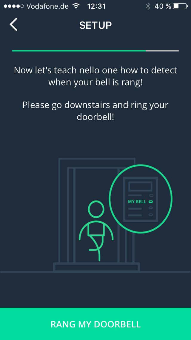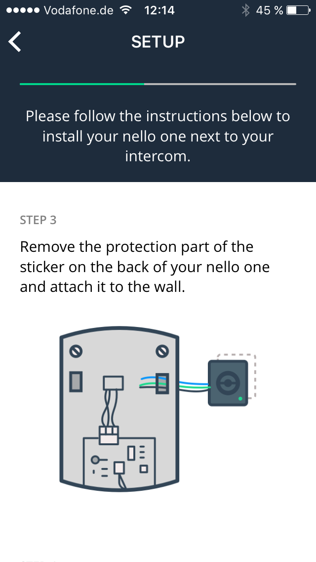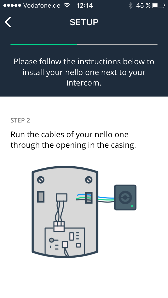 Die Anleitung im Schnelldurchlauf klingt in etwa so: Die mitgelieferten Kabel an den nello one, das andere Ende der Kabel in die Gegensprechanlage und dann das Smartphone gegen den nello one halten. Klingt erst einmal seltsam, aber die App sendet dann die entsprechenden Daten (WLAN Access Point und Passwort) per Lichtsignal (wie ein Morsecode) an den nello one, sodass er sich verbinden kann. Das klappt dann direkt, auch wenn es gefühlt etwas lange dauert (1-2 Minuten). Danach den Türöffner drücken, dann unten an der Haustür klingeln – fertig! Man ist tatsächlich in 10-15 Minuten fertig mit der Installation.