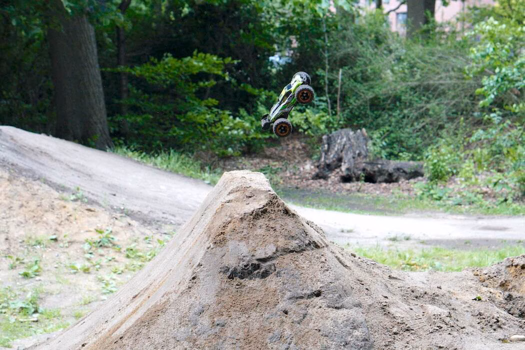 Ausgepackt, den 1300 mAh Akku mit dem mitgelieferten Ladegerät aufgeladen, 3x wiederaufladbare AA Akkus in die Fernsteuerung (Sender) gesteckt, Heckspoiler montiert und ab auf die Piste! Die Piste ist in dem Fall ein kleiner Park mit aufgeschütteten und festgeklopften Hügeln und Rampen, wo sich hauptsächlich mit Mountainbikes und BMX gesprungen und getrickst wird. Ist die Fläche mal nicht von denen besetzt, bietet sich der Bike Park perfekt für die ferngesteuerten Autos an.