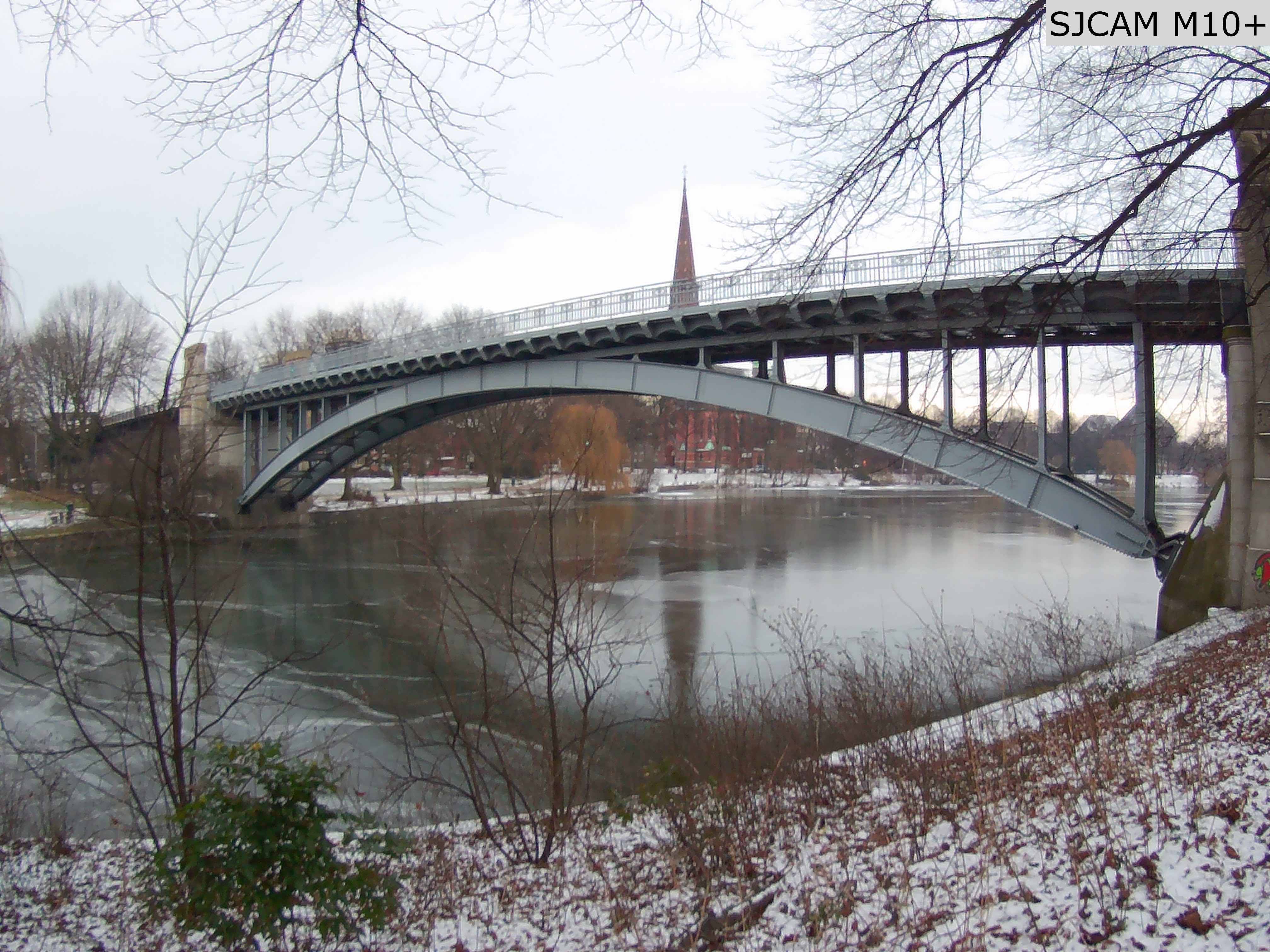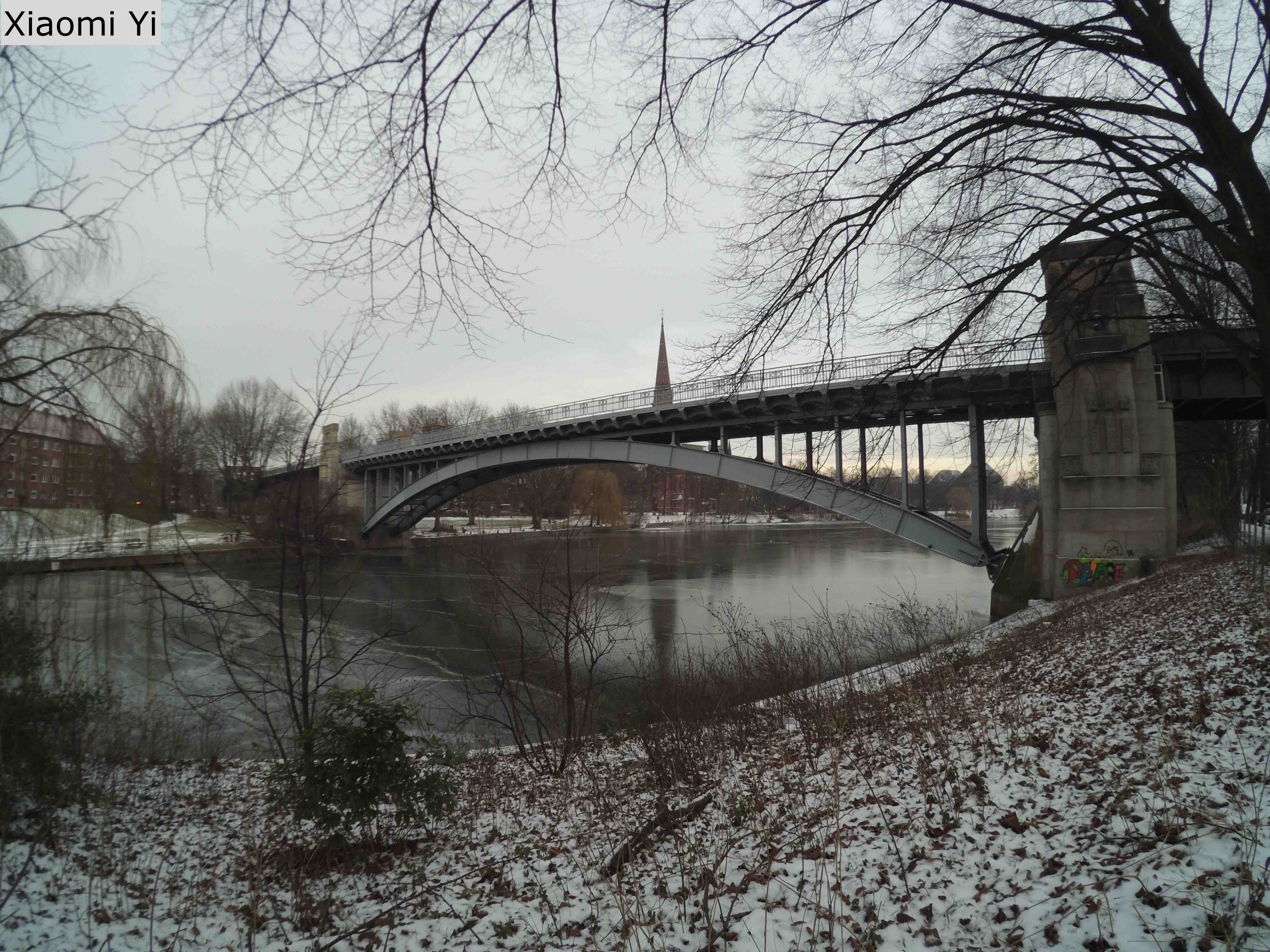 Ab 1:05 im Video kann man deutlich die Belichtungskorrektur der M10+ erkennen. Immer wenn ein Auto durch das Bild fährt, wird es heller, sodass man die Verstrebungen unter der Brücke besser erkennt. Bei der Yi sieht man diese auch schon ohne Korrektur, aber auch die Yi korrigiert ein wenig nach.